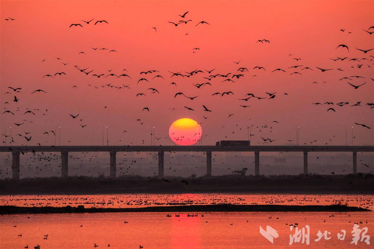 12月1日,成群的候鸟聚集在武汉市东西湖区白泉府河湿地天鹅湖滩涂上,形成一幅山水人城和谐融合的生态画卷。